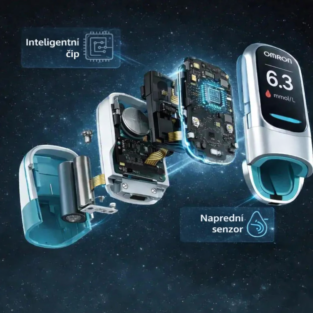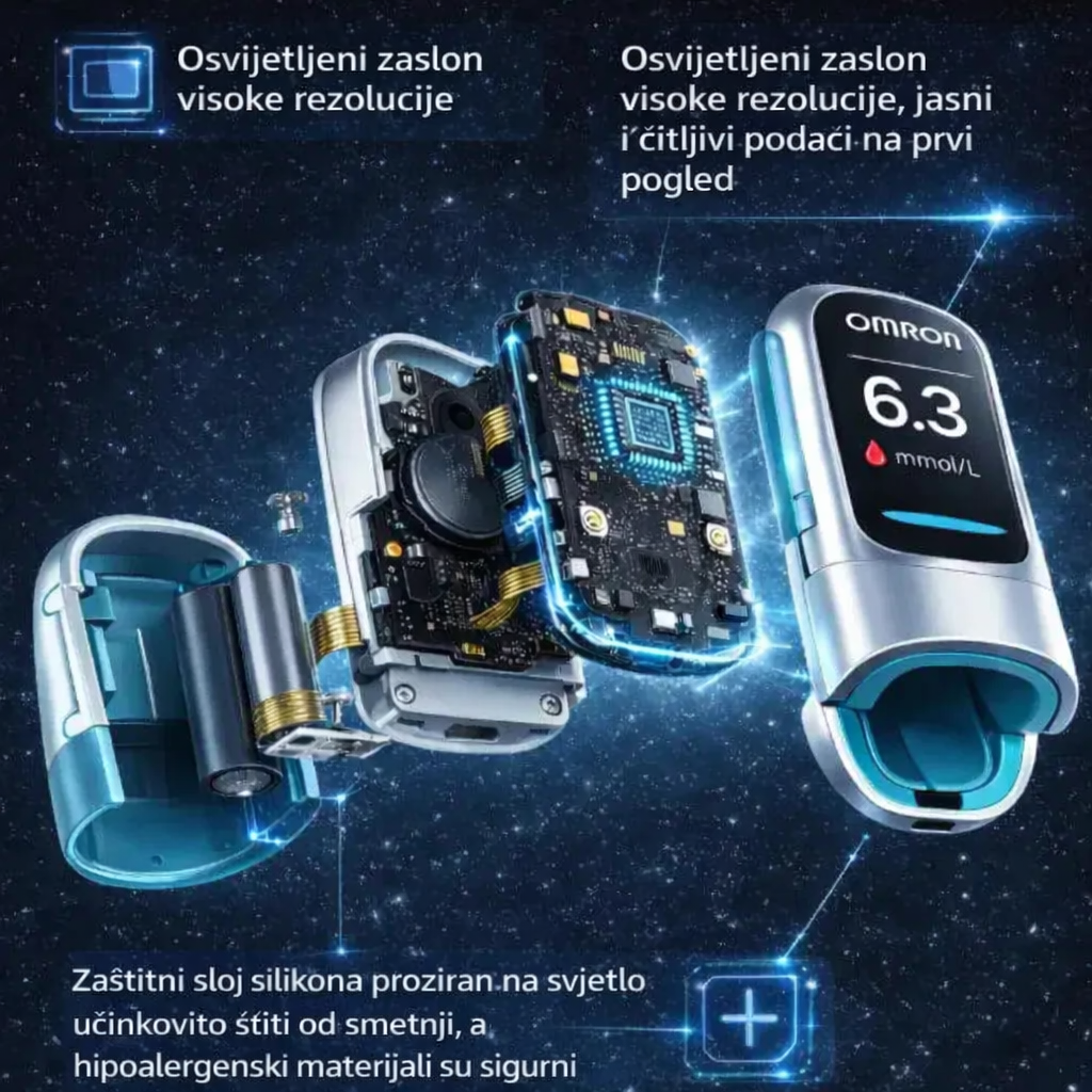 Kroz tehnologiju fotonskog čipa i analizu optičkog apsorpcijskog spektra, Omron™ pruža vrlo točna očitanja glukoze u krvi izravno s vrha prsta, bez uboda ili boli.
