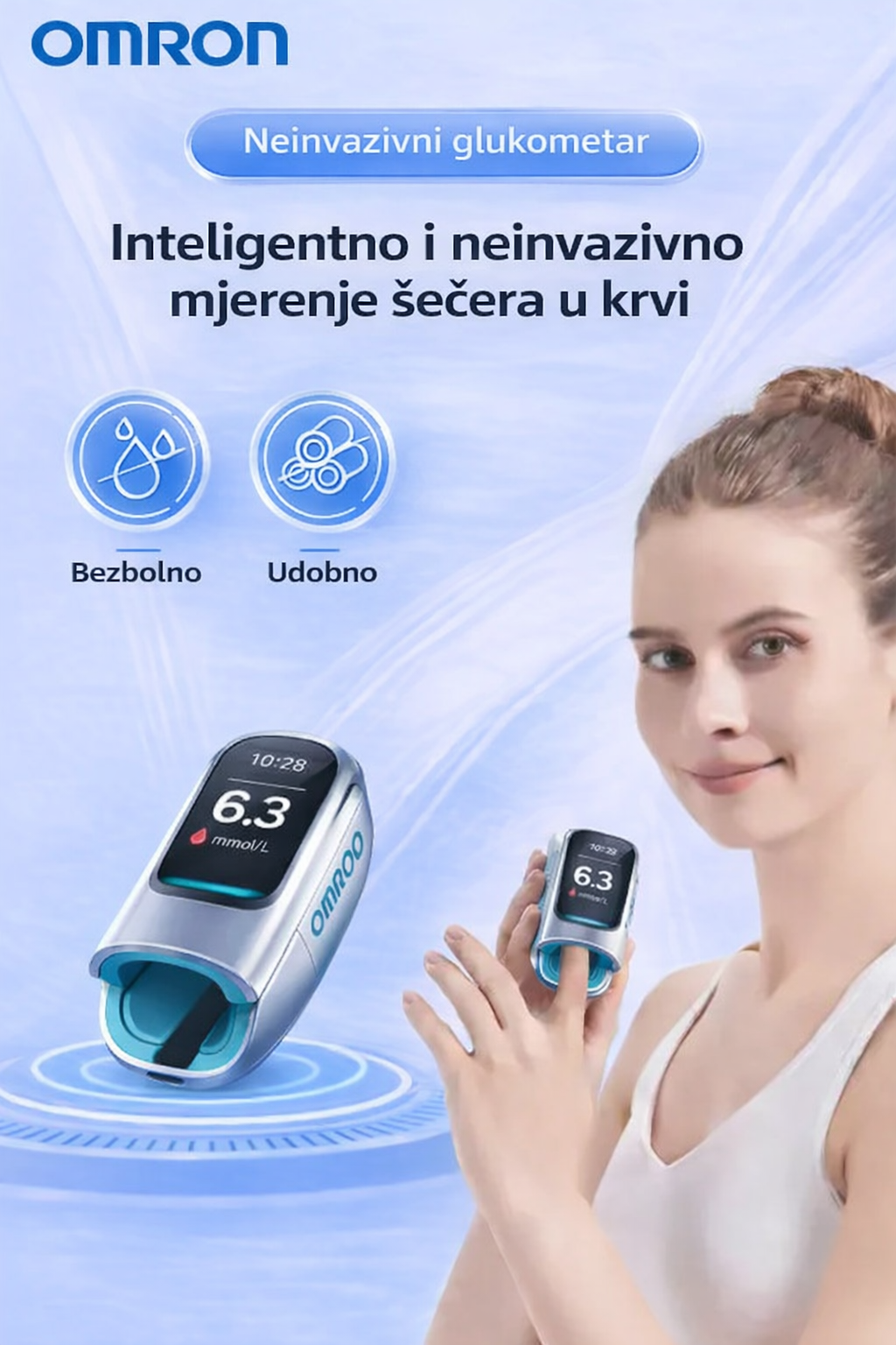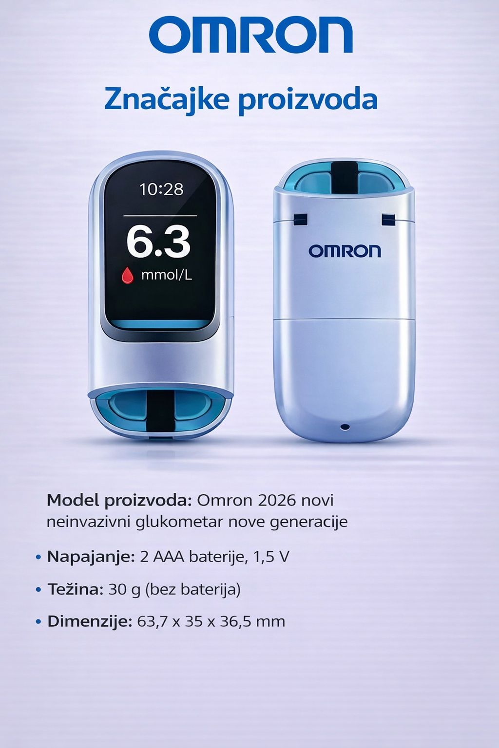 Omron™ već više od 5 godina razvija ovaj inovativni, neinvazivni i višenamjenski mjerač glukoze u krvi, osmišljen kako bi praćenje glukoze u krvi bilo jednostavnije, sigurnije i bezbolnije, pomažući u sprječavanju dijabetesa svaki dan.